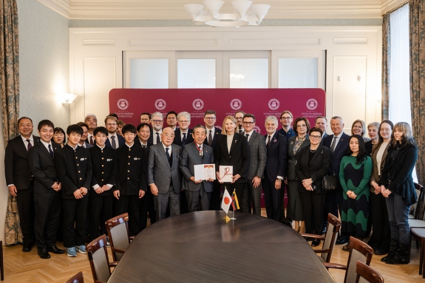 The solemn ceremony held at VMU was attended by members of Shigehiro Komaru’s delegation; the Ambassador of Lithuania to Japan, Aurelijus Zykas; Head of the Directorate for the Indo-Pacific at the Ministry of Foreign Affairs, Ričardas Šlepavičius; CEO of Hoptrans Holding LT, Rimvydas Melkūnas; Director General of Klaipėda State Seaport Authority, Algis Latakas, and his adviser, Kornelija Butkutė; member of the Kaunas–Japan Friendship Association KAJADA, Rasa Bortkevičienė; Founder and Board Member of the Sugihara Foundation “Diplomats for Life”, Ramūnas Garbaravičius, and its Project Manager Emilija Šakalienė; President of the Kaunas Chamber of Commerce, Industry and Crafts, Zigmantas Dargevičius; and journalist, cultural figure, and publicist, Birutė Garbaravičienė.